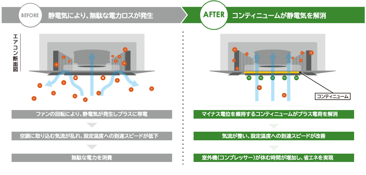 CONTINEWM(コンティニューム)は、空調機内に発生する静電気を除去し、空気の流れを整えることで、室外機の稼働率を低下させ、省エネの実現に貢献