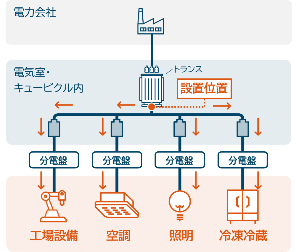 FORCEは、電力会社から電気を受ける設備に設置します。電気設備の“上流”に設置することで、建物全体の省エネをまとめてサポートします。